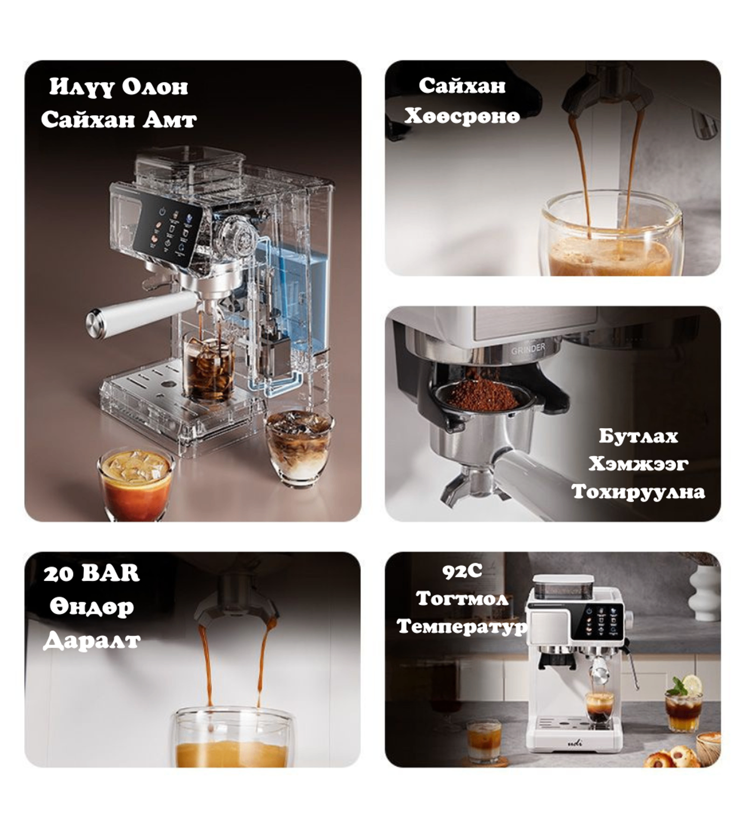 - Олон Төрөл: Энгийн эспрессогоос гадна сүүтэй ундааг (Латте, Капучино, Маккиато) гэртээ хийх боломжийг олгоно.