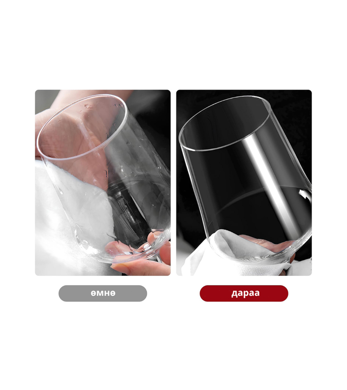 • Толбогүй, тунгалаг: Усны дусал, хурууны хээ, өнгөрийг ямар ч үлдэгдэлгүй арчиж, таны шилэн эдлэлийг болор мэт гялалзуулна.