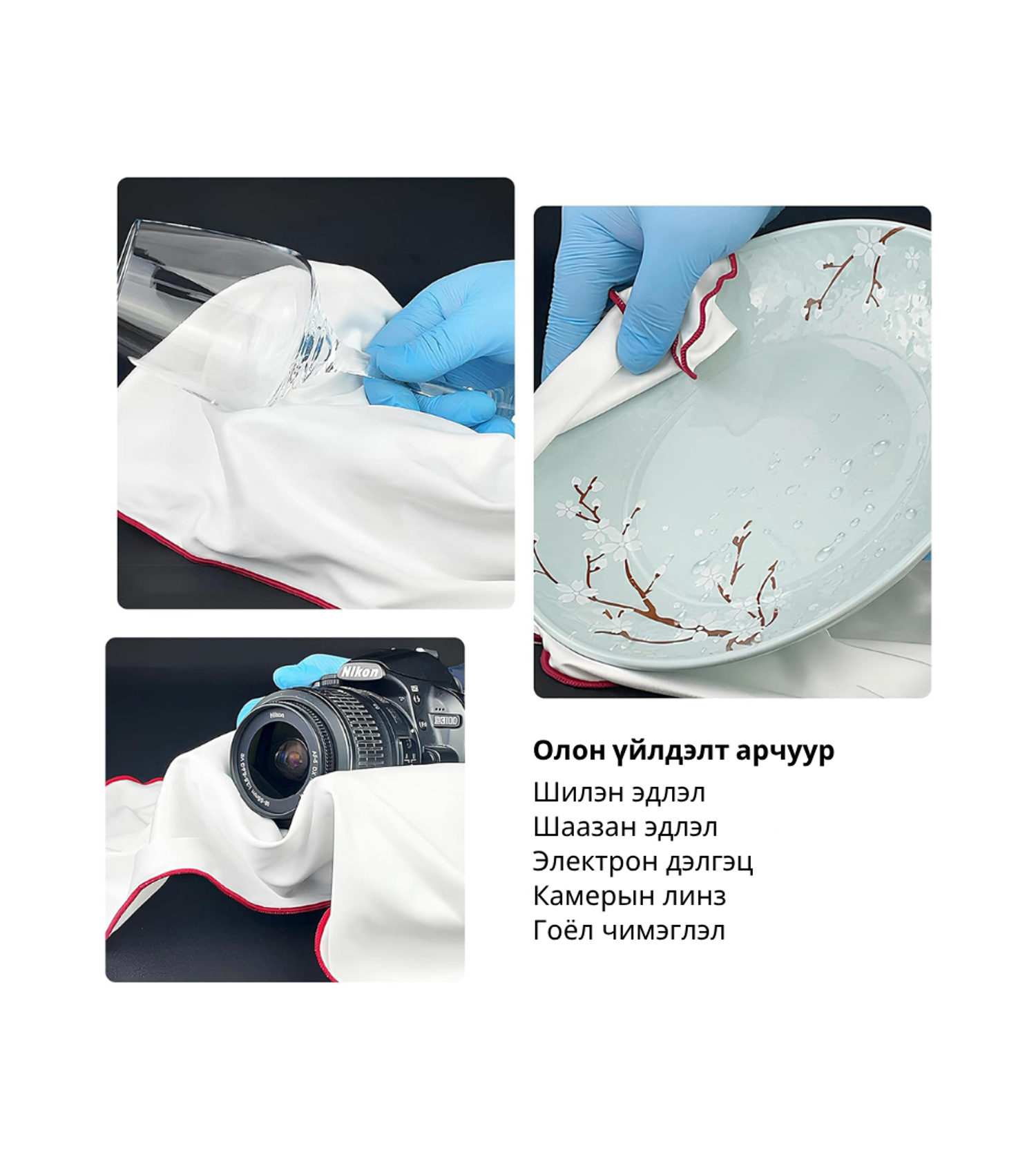 Төгс гялалзуулагч болор, шил арчих мэргэжлийн алчуур. Хамгийн эмзэг гадаргууг ч гэмтээлгүй, төгс цэвэрлэхэд зориулагдсан. Ресторан, баар, мэргэжлийн түвшний цэвэрлэгээг хийхэд зориулагдсан. Камерын линз, бүх төрлийн дэлгэцийг хамгийн нямбай сайн цэвэрлэж арчина.