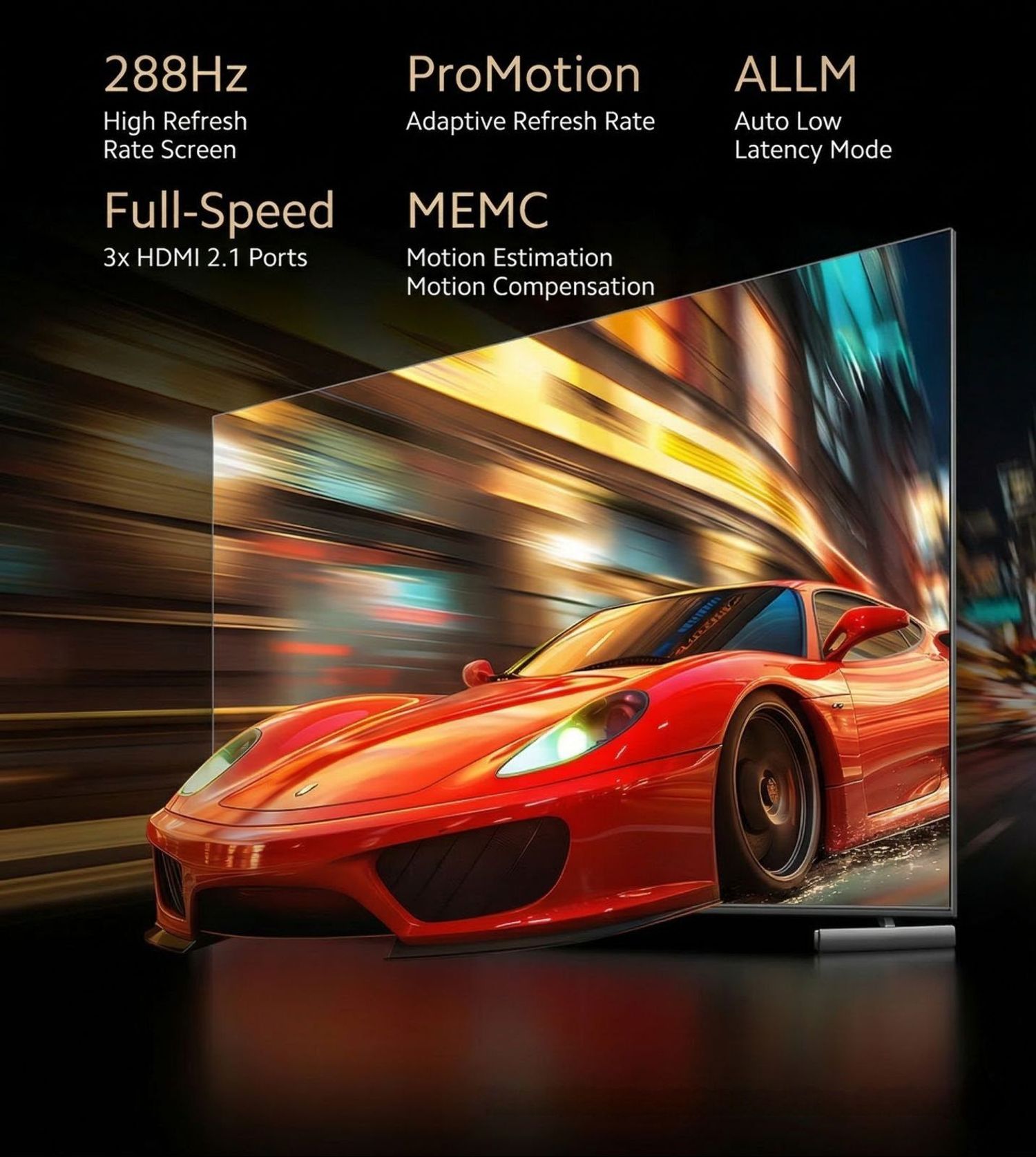 Дэлгэц болон Дүрсний технологи: Smart Mini LED технологи, 288Hz ProMotion дэлгэц, Motion Estimation, Motion Compensation, 4K Ultra HD нягтрал, Harman Acoustic System 2.1.2, Хүчирхэг Subwoofer, Dolby Atmos & 3D Surround, 48Gbps өндөр хурдны HDMI 2.1 (3 ширхэг), 4GB RAM, 64GB ROM, ALLM.
